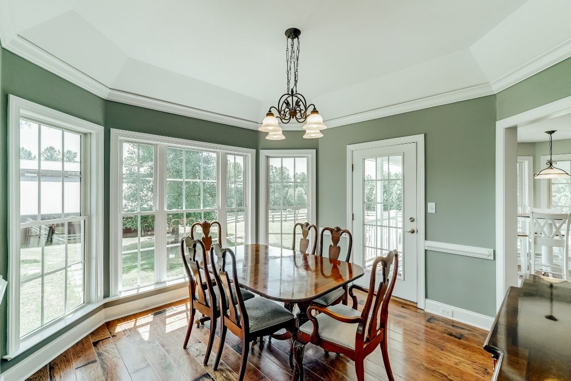 Formal dining room with hardwood flooring.