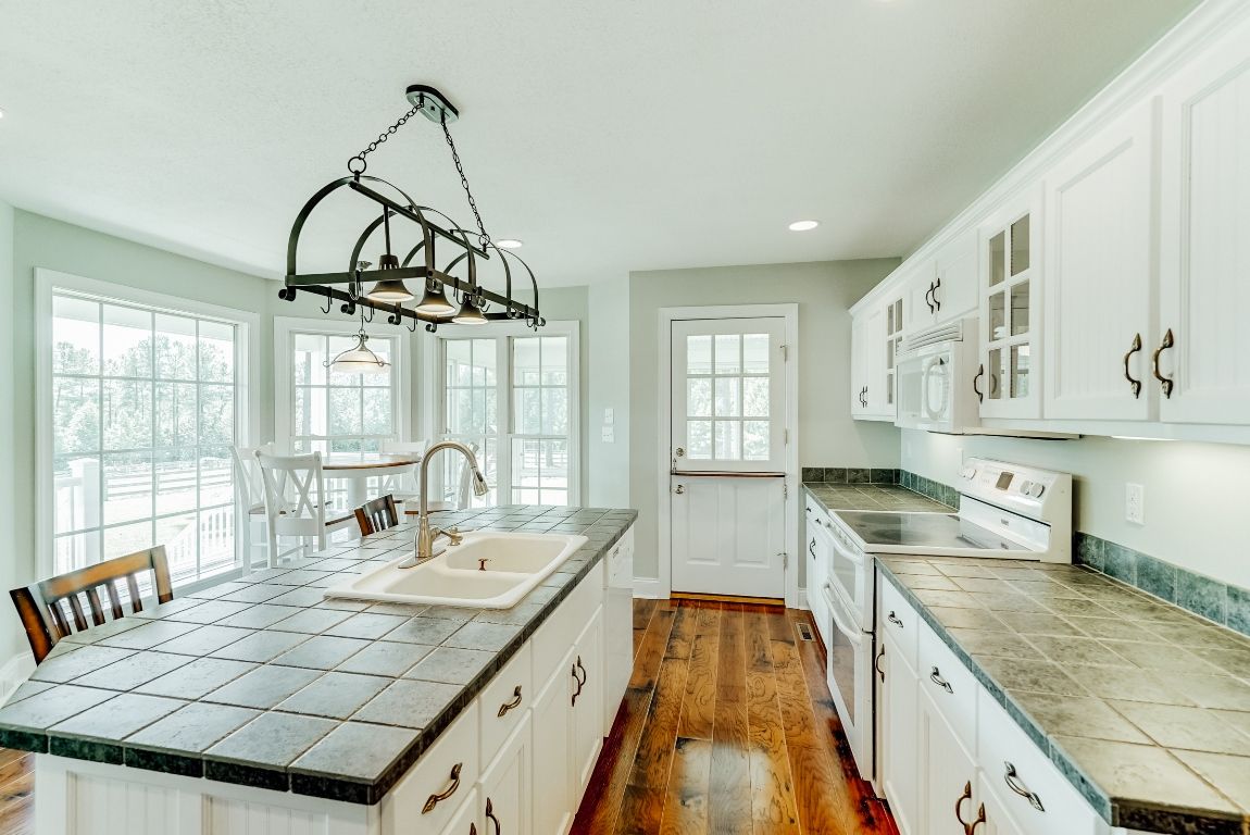 Ceramic tile counter top in kitchen with center island.